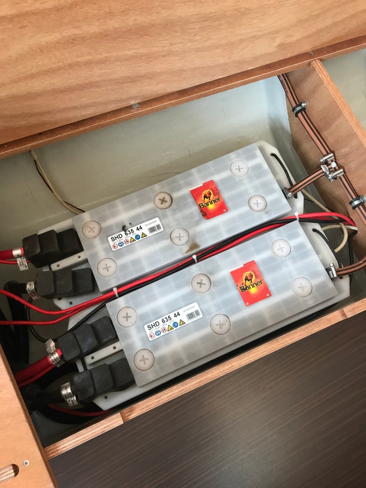 It seemed to be running ok but quite busy! Going to bed and sleeping late till 9 am the cabin had a strange acrid smell and slightly sulphurous. The battery charger was busy working away and on hearing a strange bubbling sound from underneath the port side cabin benches I lifted the seat base to find the slightly alarming sight of one of the large ‘house’ batteries boiling its electrolyte! Immediately I switched everything off and disconnected shore power! Both batteries had now started to boil, certainly the middle cell where they touched the other batteries.