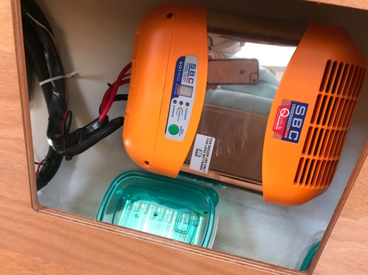 Back in Sovereign Harbour on Friday night we reconnected the shore power and switched on. Everything seemed normal, the Quick branded smart charger seemed to be working fine and the battery gauge on the instrument panel said it was charging at 14 v which seemed normal for quite flat batteries!
