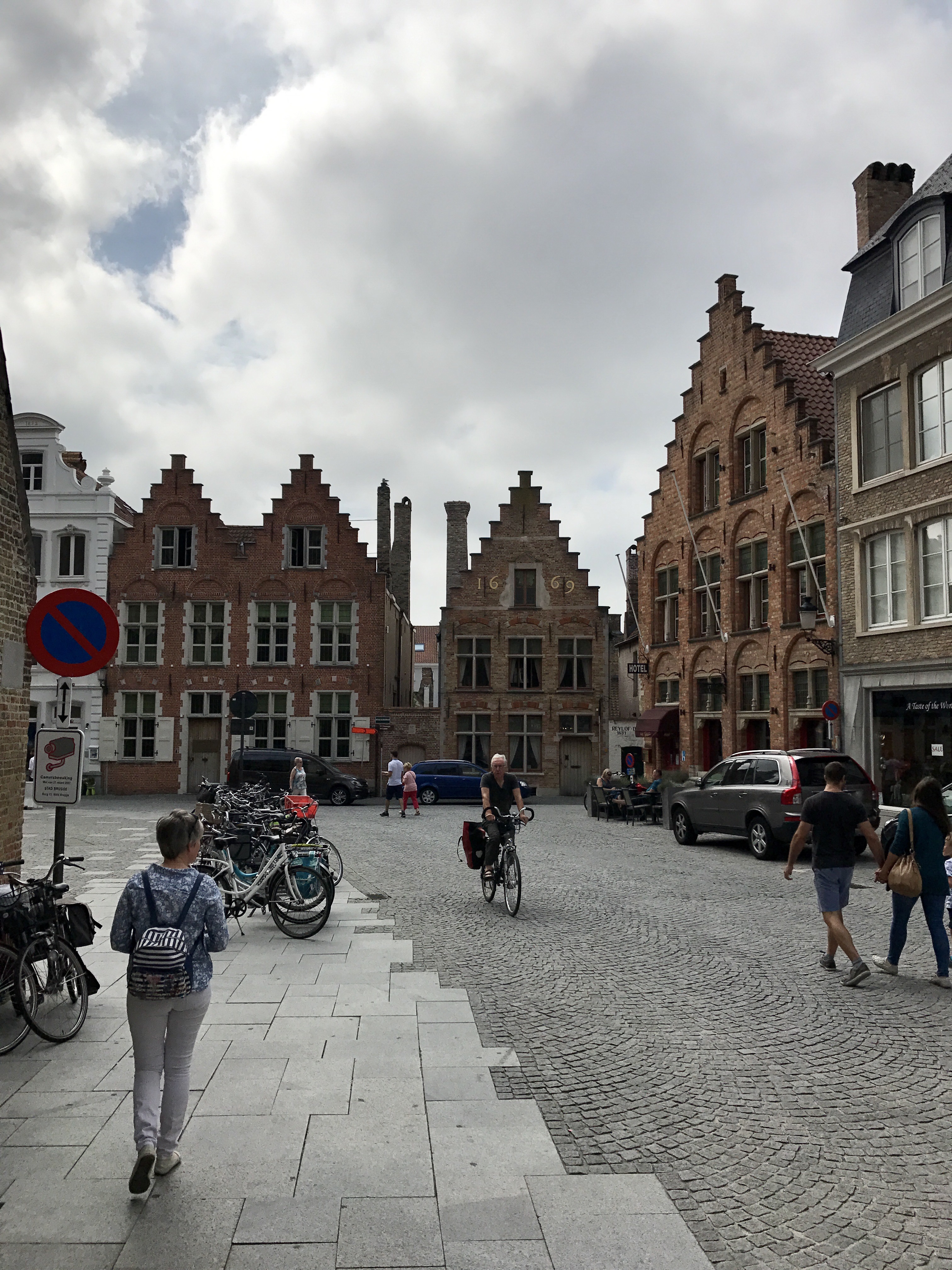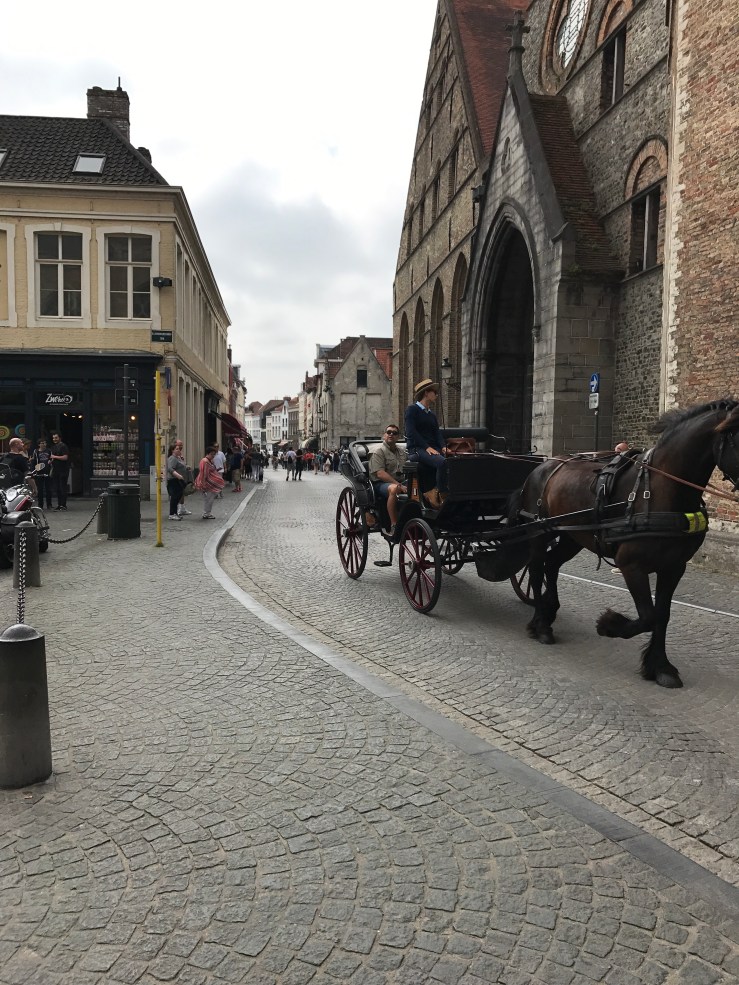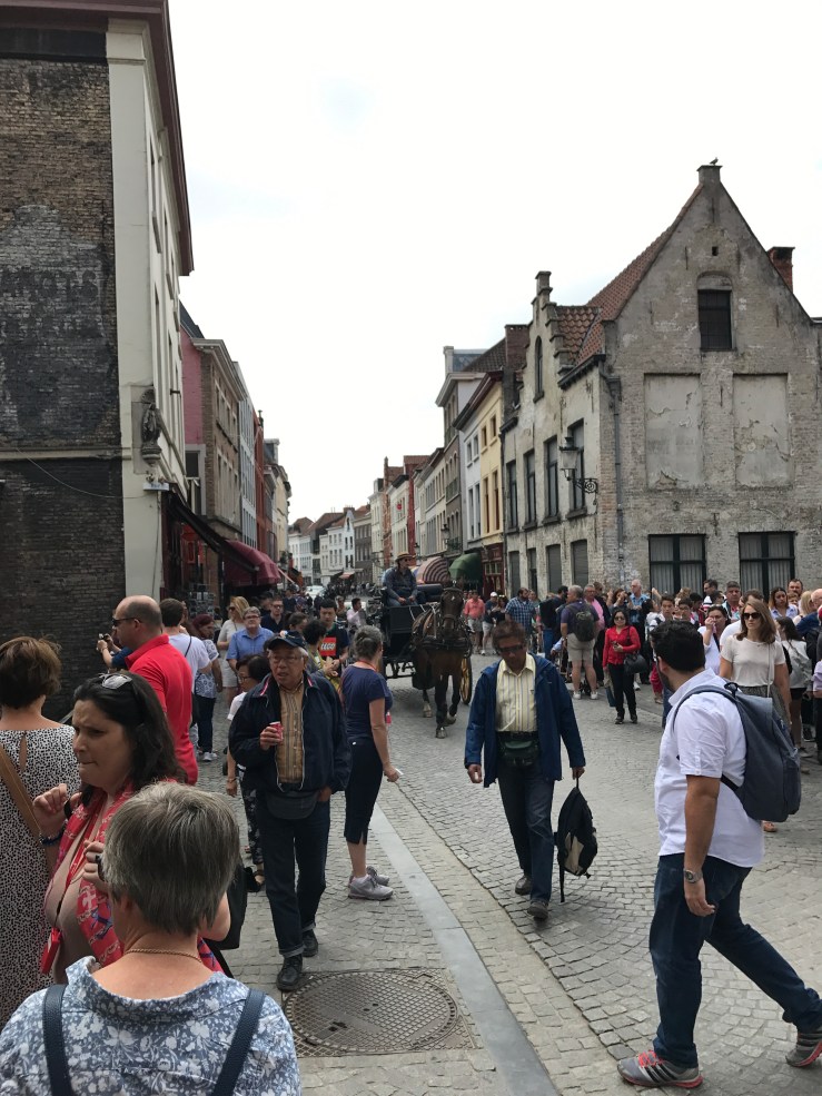 Once in Brugge, we just follow everyone else! They must be going to somewhere interesting…. we guess. The town is heaving with people. It is very picturesque but out of every alleyway pile streams of people, all following umbrella wielding guides. Again we get swept along with the flow, avoiding mad cyclists tearing through the crowds at breakneck speed or dodging horse driven city tours.