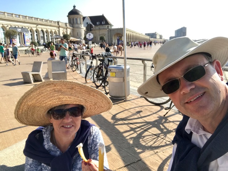 Now Oostende is a revelation if you love beaches and I do! We walk to the seafront and there is a beautifully wide promenade that stretches for miles and miles. It’s beach is wide with lovely fine sand. It is lined with white beach huts, shops selling buckets and spades, in fact everything you need for a fun day playing on the sand!