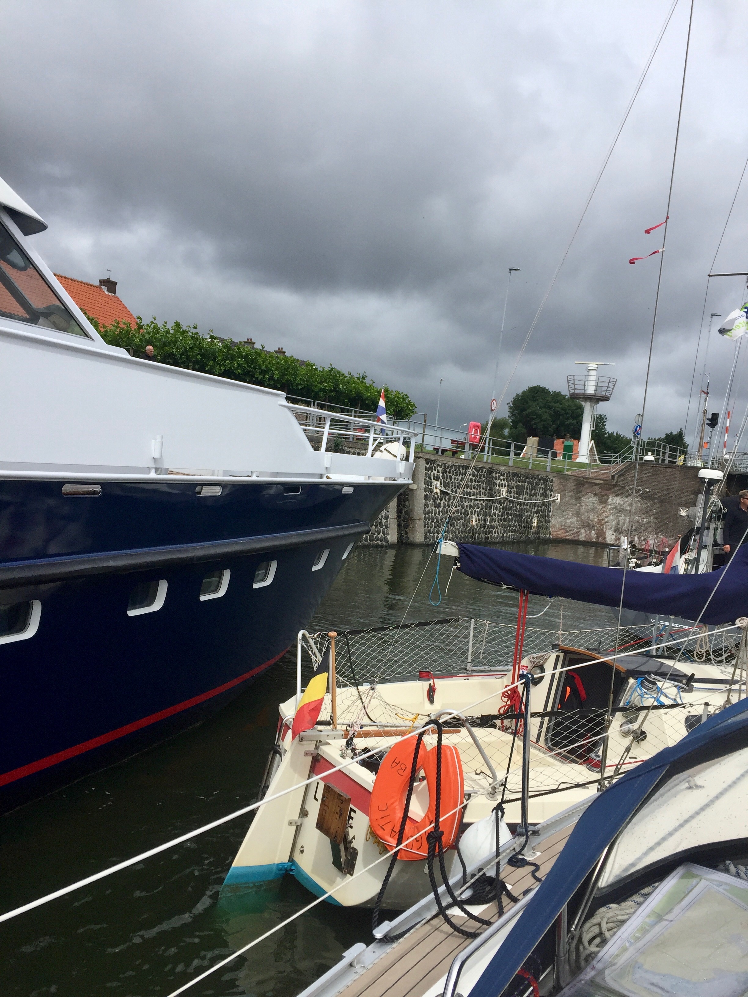 We get the green light and are off! There are three boats going through the lock and we are last in. Everyone else leaves without drama. I have tied up on the windward side of the lock , my logic is that the wind will blow our bows out to leewards, I just need to give her a bit of gas and punch her out through the opened gates and into the Veerse Meer and freedom. Disaster strikes almost immediately, as I bring the bows pass the open lock gates a strong gust catches them, spins them round and bounces us about the inside of a very hard stone lined lock. I lose control of Grace but Anne secures a line to the lock wall and we are under control again but facing the wrong way! A bit shaken up I radio the lock keeper to say that we are stuck in the lock. He calmly says;” yes, I can see that! What do I want to do?” I resist the temptation to say go home and never come back! And merely reply with remarkable sangfroid “oh, I will exit back into the canal and then have another go.” All said in tones of Just William.
