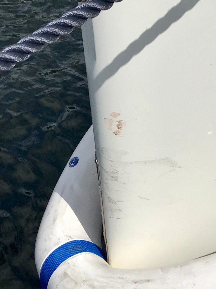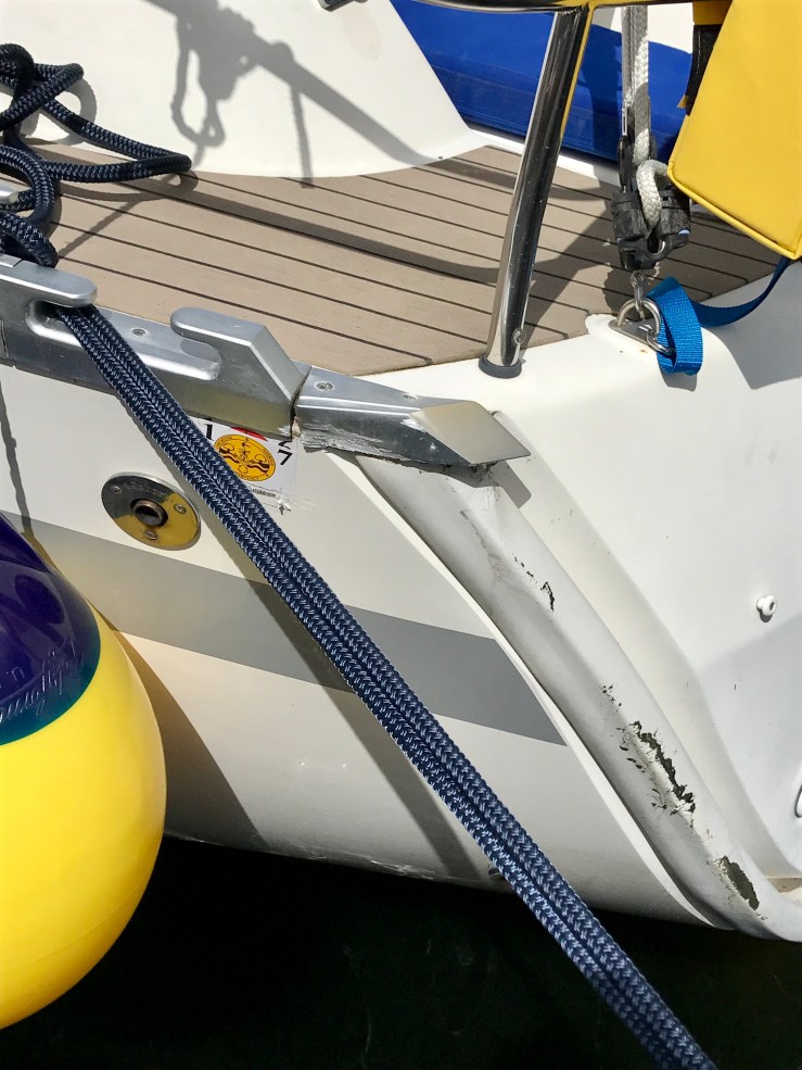 This will respond well to someone who is good with GRP. It is above the chain locker so I don’t think will leak into the boat. The aluminium trim covering the port stern deck joint is crunched and bent but responds well to my lump hammer as does the plastic trim protecting the stern.
