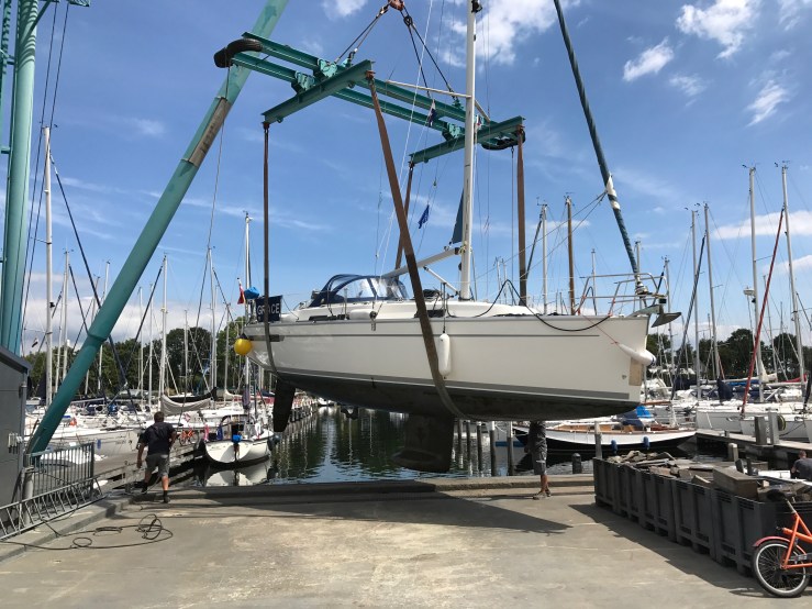 Grace had been lifted that afternoon, a bit of an alarming experience as the Crane operator undoes the back stay of the mast – I thought it was there to stop it from falling down but am assured that it will be fine…..usually! Worse is to come, he slips two straps under her hull and dangles her out of the water!