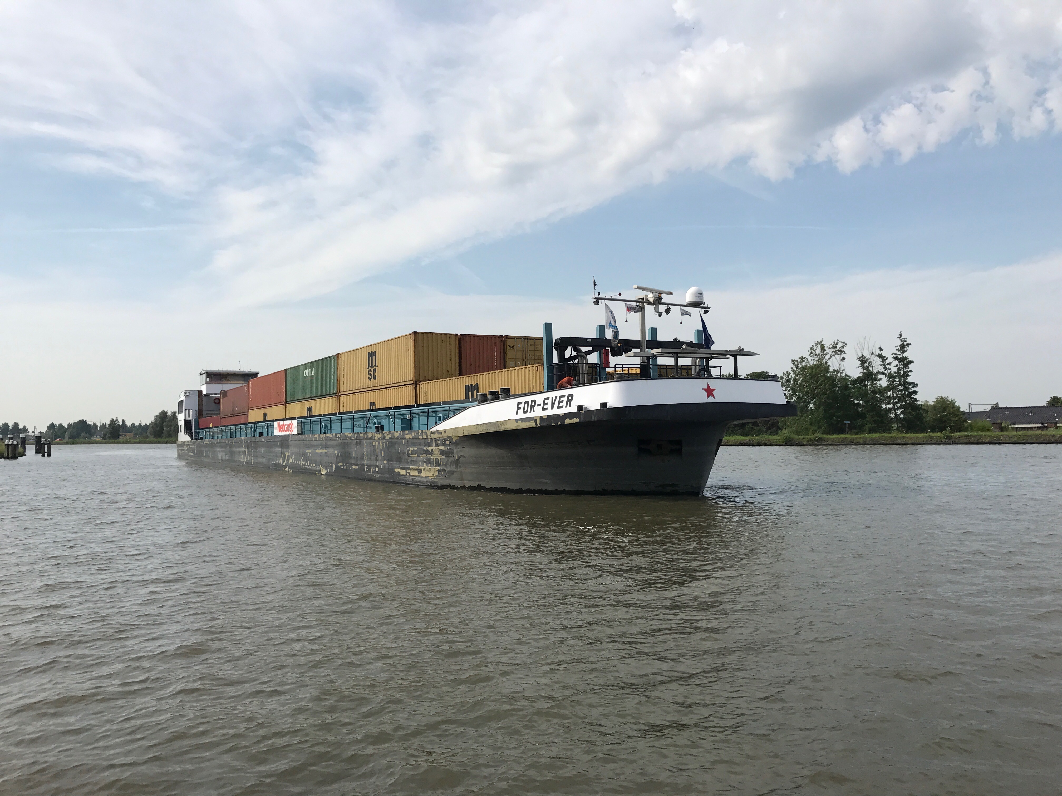 Back out in the main channel and heading towards our first bridge of the day for its opening at 1028 I noticed a large barge packed high with containers – our dilemma is do we go through the bridge before him or after. With two minutes to go that question was answered. He dropped his mooring lines and pushed to the front of the queue. I’m not going to argue with a 7000 tonne barge in my 7 tonne yacht!