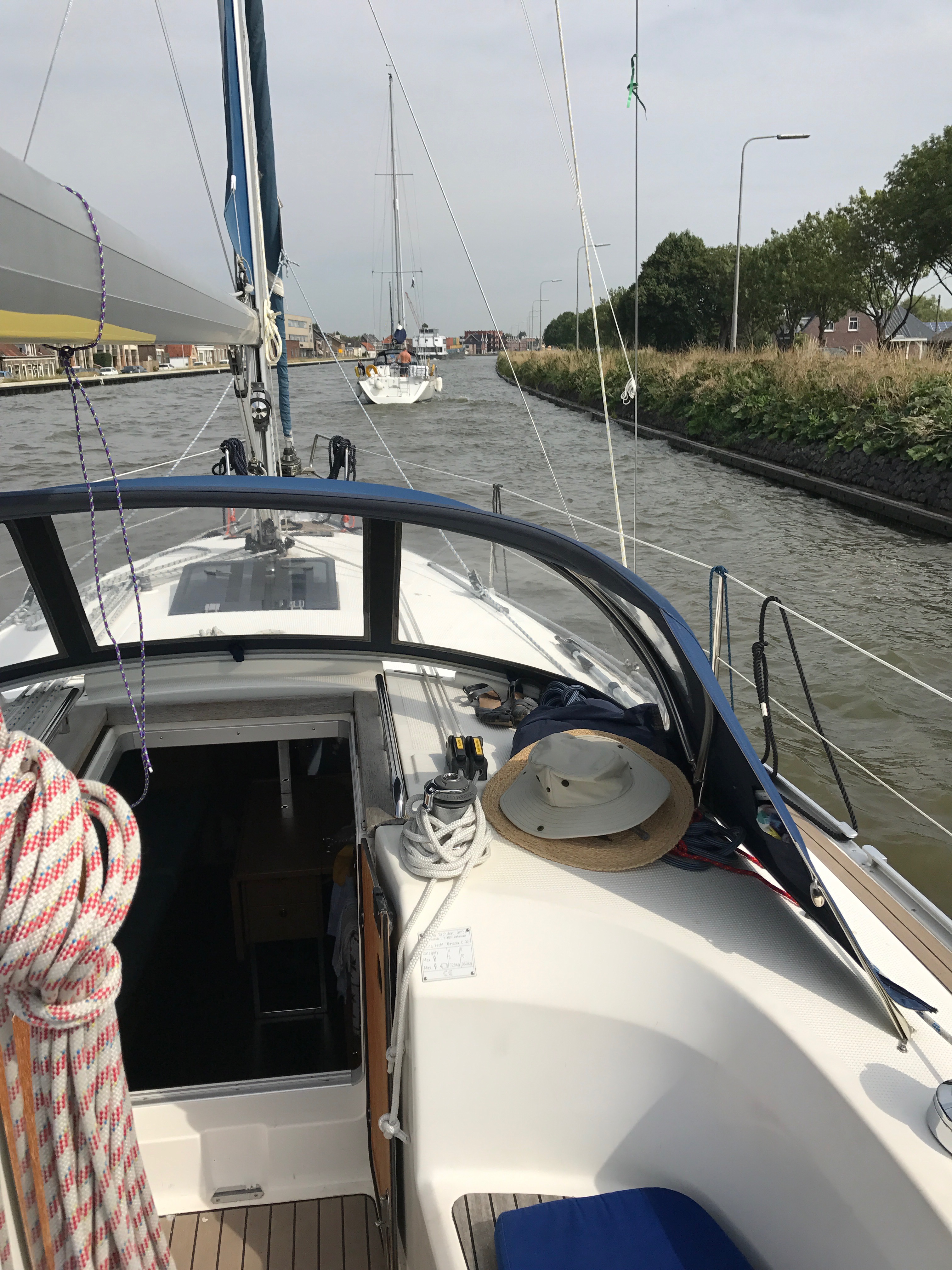 It was a good plan to hang back as commercial traffic get priority at bridges and locks and we get green lights all the way! Along with 4 other yachts we rattle along at 6.5 knots in convoy behind the For-Ever and through the bridges: