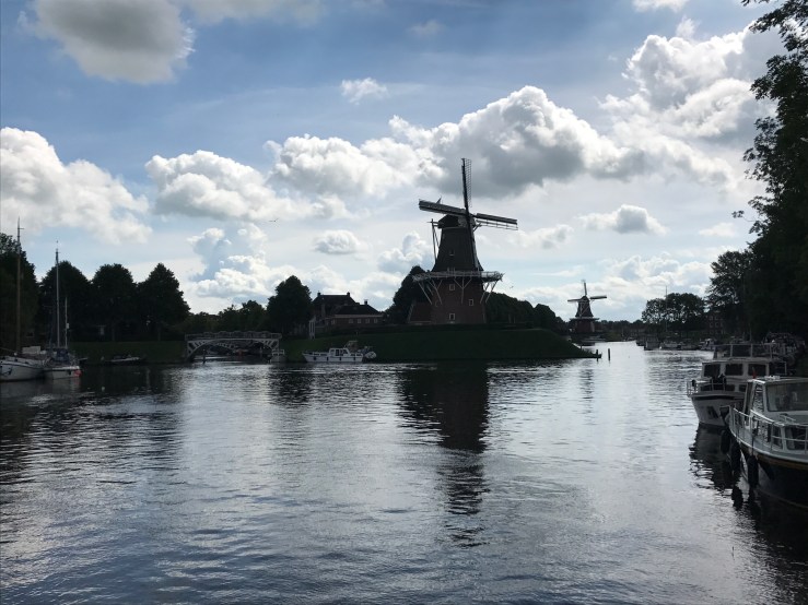 We continue down the Dokkumer Le towards Dokkum where after handing over 5€ into the inevitable clog we entered the old moat around the town and moor up between two windmills.