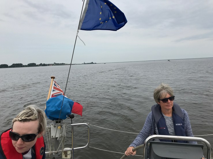It is not long before we are sailing in the Reitdiep towards Lemmerburen. For the next 7 bridges we follow a large blue motorboat that sounds it's horn at the bridges – a completely useless exercise as they are all unmanned and controlled from an central office in Lemmer. We VHF the lock keeper on channel 85. Very soon I am on friendly terms with the controller and despite my terrible pronunciation of the bridge names he starts to anticipate us and the bridges are ready and waiting for us and we fly through! At Garnwerd he even warns us of lots of boats queuing to go to a restaurant on the other side of the bridge!