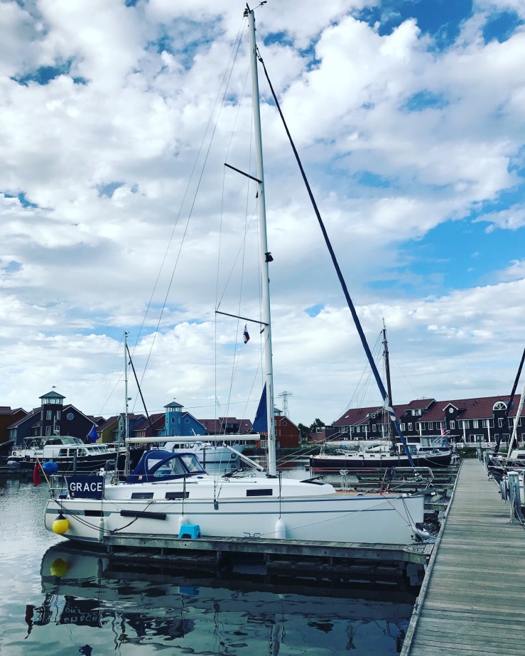 We as are about to depart the visitor's pontoon at Oostmahorn I get the idea in my head that it would be good to practice springing Grace off the pontoon. I always struggle to get her off and away without drama and loss of fenders when we are alongside. I blame it on Grace's fat bottom but it is probably my incompetence! I put on a slip spring from the stern cleat to one at Grace's mid point on the pontoon. I then go astern and her bows are gently pushed outwards to about 45 degrees, pivoting about her stern fenders. I then go forward for a perfect gentle exit!