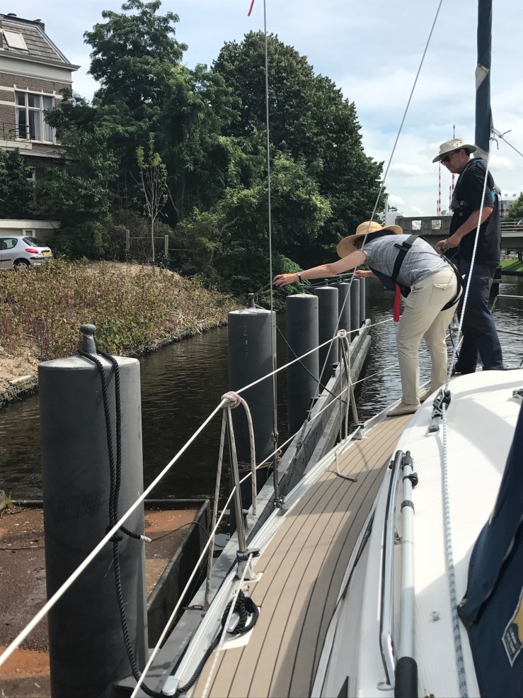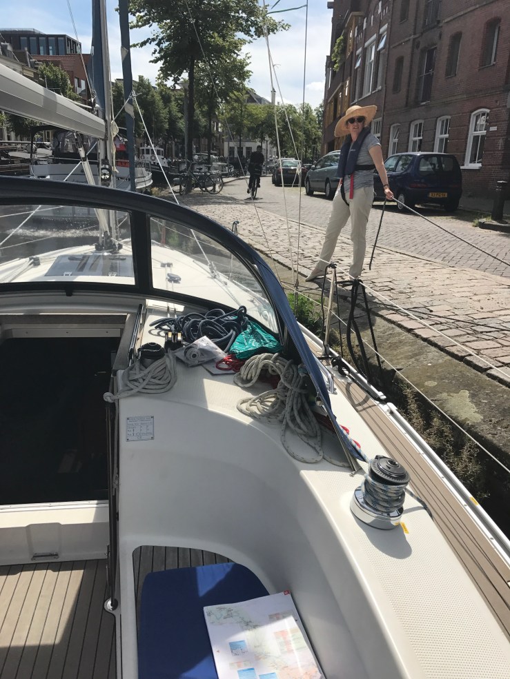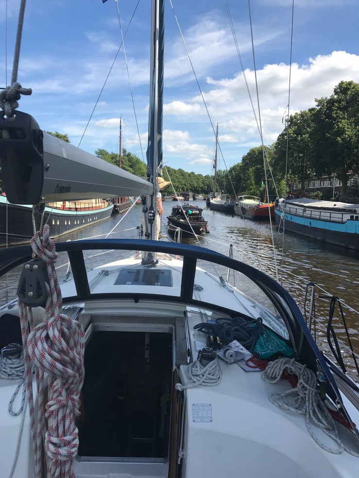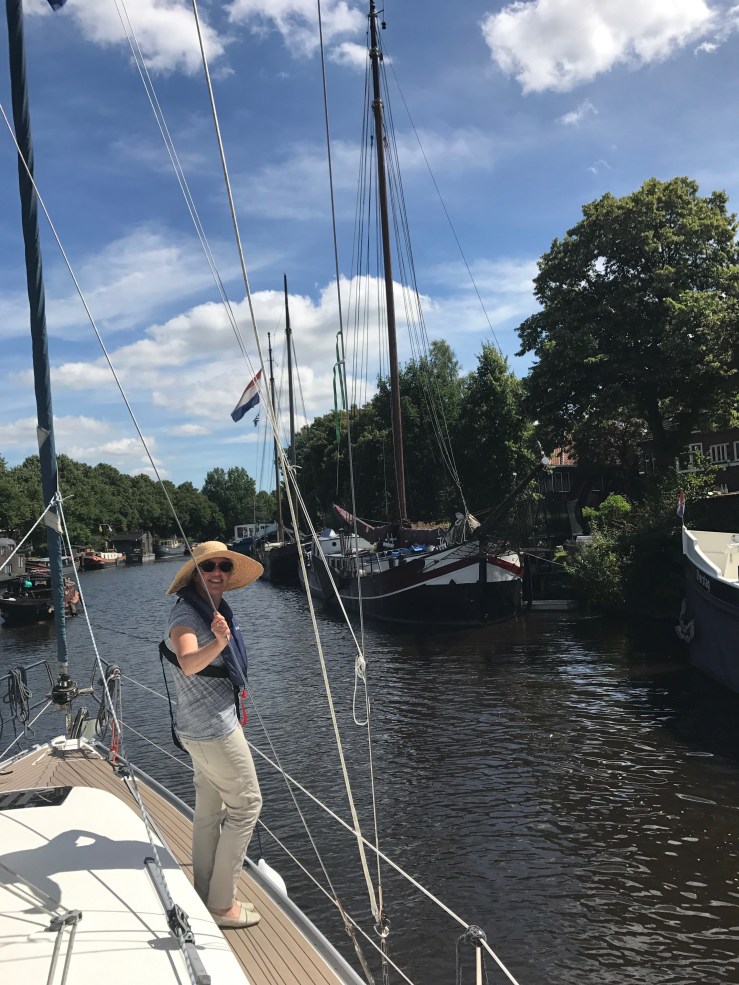 At the junction with the Emms canal three major canals meet, either taking you up to Aachen and Germany or out to Delfzijl and the sea. It is here that we meet a big barge heading for Germany, chaos ensues, horns are sounded, much engine revving occurs as the barge attempts a 90 degree turn surrounded by yachts and motorboats. I am too much of a coward to do battle with him and retreat out of his way. In this case, discretion really is the better part of valour! We miss the bridge opening but are in one piece and are safely moored to the waiting pontoon. Time for tea and ginger cake!