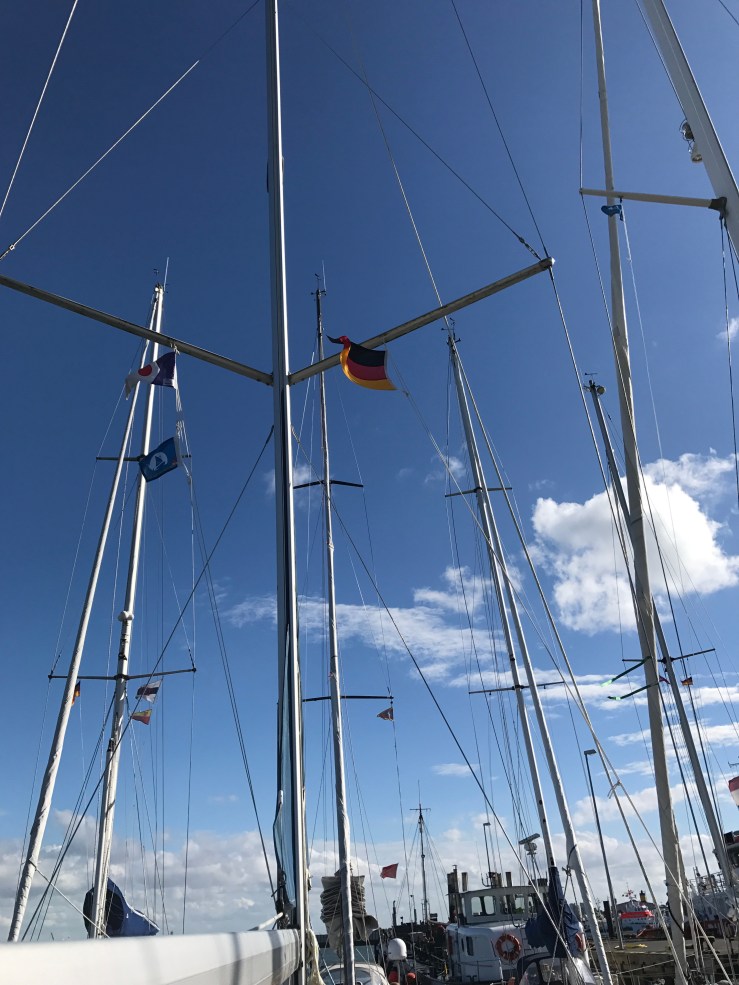 After 6 hours sailing we enter the Fischerbalje at Borkum, as with most Frisian Islands the channel is just the start of a typical 10 mile slaloms in between sandbanks and over bars to reach the harbours located behind the islands and away from the prevailing North Sea winds. This involves trying to reconcile what you see on the charts and chart plotter with the actual location of the buoys. The advice is always follow the buoyage and not the charts as the sands shift all the time! We also had the dubious pleasure of trying to follow withies, which are simply tree boughs stuck in the mud, if the branches on the top point up, then keep to port, if tied down then keep to starboard……as you can imagine most of the ones we came across had the top broken off in the high winds, so a bit of guess work was required at times! No wonder Davies in the 'The Riddles of the Sands' was always running aground and 'kedging off'…….we often felt the same. Borkum is particularly unlovely for a Frisian Island, there is a delapidated yacht harbour, Port Henry and a larger, ex-military harbour, Burkanahafen which has the lifeboat, a ferry and workboats to service the wind farms that dot the area. It does have a lovely all tide entrance though which is a relief after weaving around the channel to get there! We cannot find anywhere to moor and no one to help or advise, the harbour master does not answer her phone or vhf so we sail back to the yacht harbour, the gap into it is drying fast, there are old tyres on the posts but we get in okay despite a strong cross current across the entrance that tries to push us on to the posts, I understand what the old tyres are there for now. The pontoons are all rickety but at least they have space. Moving forward to the first space we suddenly shudder to a halt, stuck in the mud! There is only 1.2 m of depth and we draw 1.5 m. Going astern hard we pull free, I realise that I must get Grace out of there if we are not to be trapped by the falling tide. It was 1.7m when we went in, it is now 1.5m so no time to waste! Plenty of throttle and Grace is back out in the channel. So back to Burkana, we tie along side a long quay on the western side of the harbour, opposite to the lifeboat. I go ashore and ask in the only place open, a dump of a bar and get told that we must move to the northern end. We do this only to be moved on again but this time by the harbour master who tells us to raft up opposite. We do, onto a nice Dutchman who is very helpful. It has been a run of 26 miles today and our first experience of the German Bight is over. It is not long before we are joined by other boats and soon we are rafted 6 deep with 3 boats on our outside! There is nothing to be done but pay our fees, use the portaloo facilities and go for a walk….I can confirm there is nothing to see in Borkum, it is all a bit miserable. We are now in Germany and take down our Dutch courtesy flag and replace it with a German one.