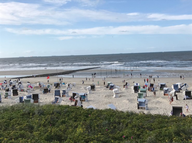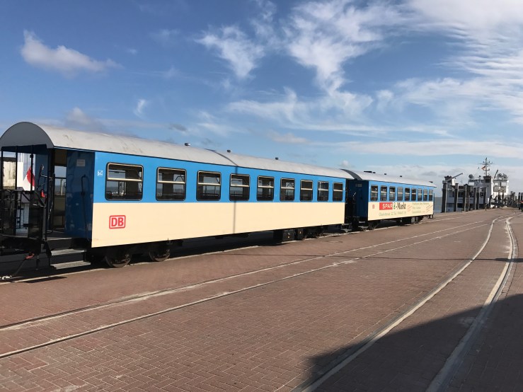 Wangerooge is a funny little island. There are no cars, the only transport is an ancient train that takes people from the ferry to the town. There was one waiting in the siding and we slipped on board along with the ferry passengers and sat in the corner with our dark glasses on and hats pull down low hope the conductor would not throw us off and make us walk.