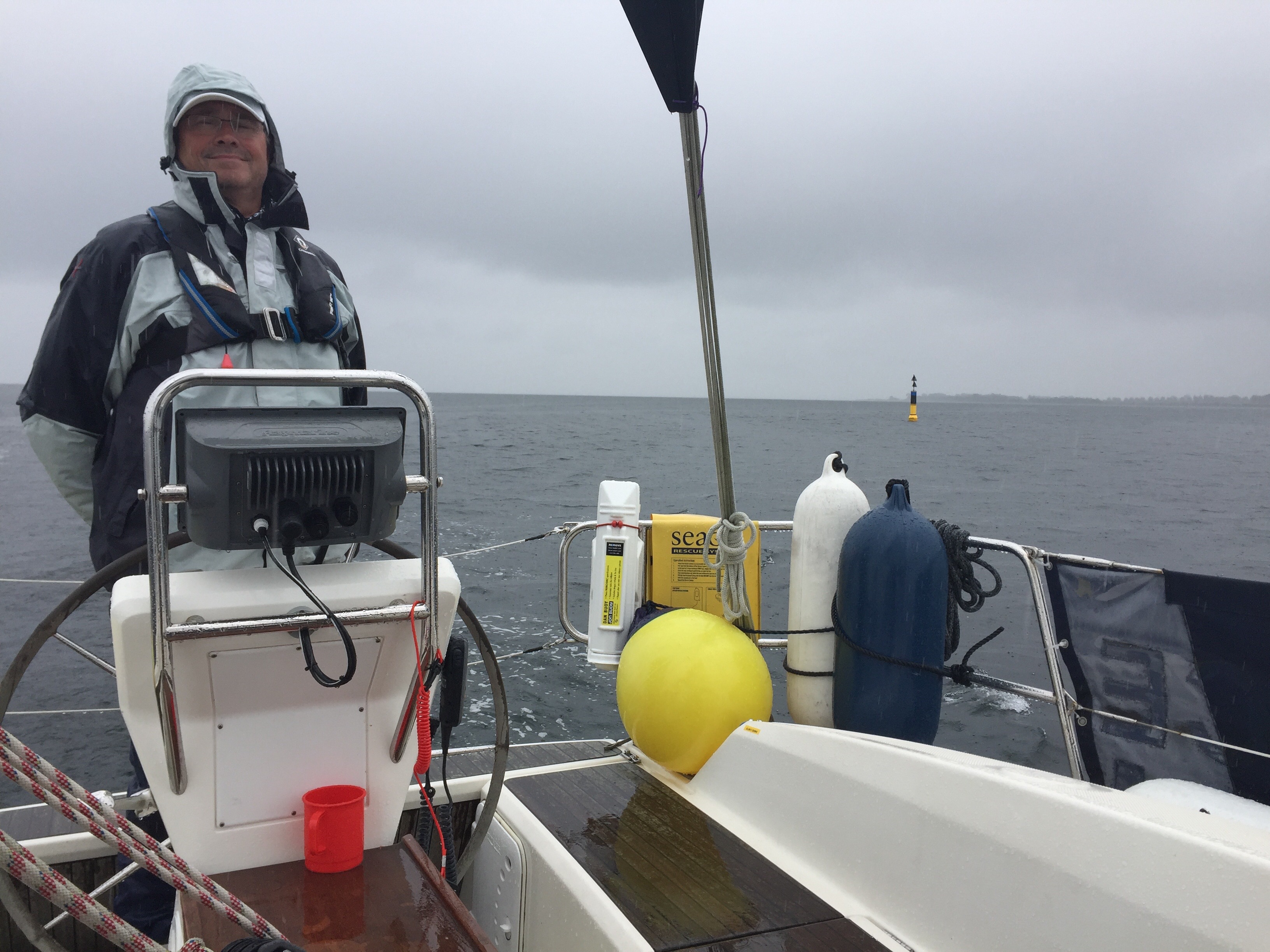 Our original destination was going to be Vejro, a small private island with nice moorings however we are at the turn point for the island’s harbour by 1300 and we have made such good progress that we decide to press on to Omo. So changing on a bearing of 300 for 14 nm we reach the safe water mark at the head of the Omo Sund. The wind has dropped and the rain set in! Round here they say that there is no such thing as bad weather, just bad clothing…..I am not so sure, we are both in our Mustos and Hifits and we are soaking wet but are committed to doing the next 3 or 4 hours!