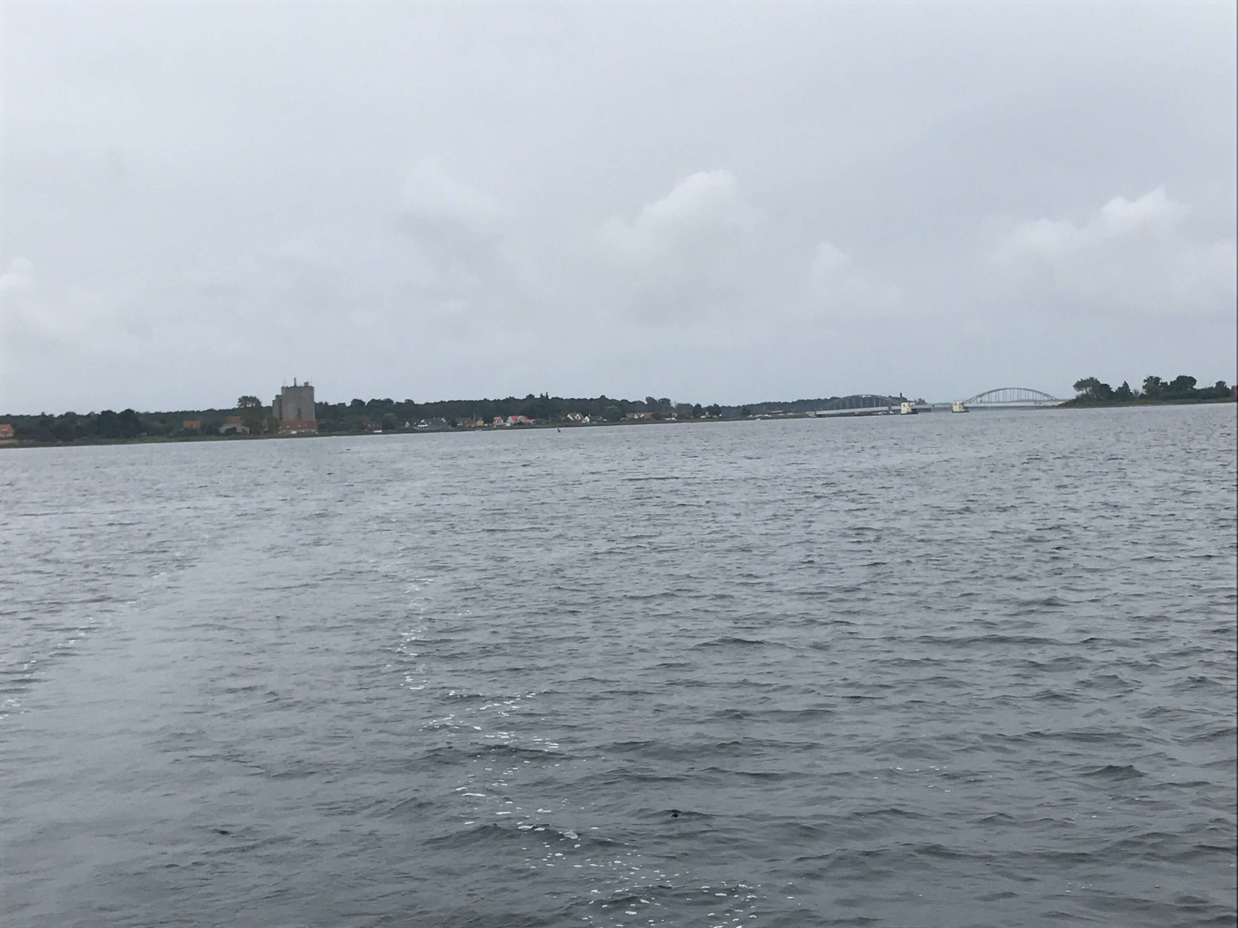 At 0900 we leave Nykøbing in an airless drizzle, visibility is around 5 nm and we are soon feeling a bit cold and damp as we follow the 8 nm channel out to the Guldborg bridge. Feeling a bit grim and determined not to hang about for the bridge to open. I do not stop or slow down, Grace is motoring towards the bridge at 4.5 knots and an easy 1000 revs. It is going to be who blinks first, the bridge keeper or me! It is him! With just 200m to go we get the red lights and the bridge opens and we are through into the Smålandsfarvandet.