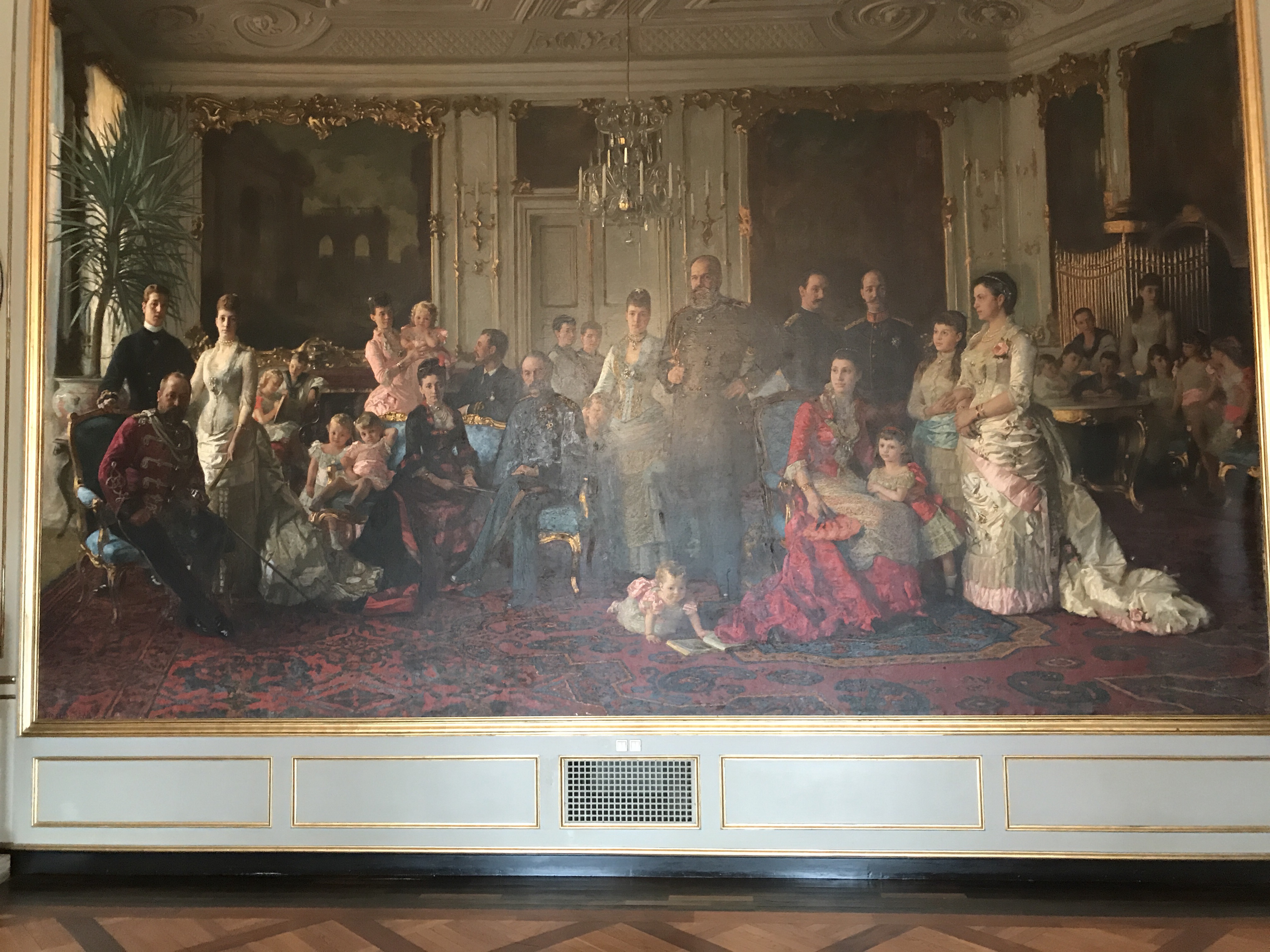 We had completely free reign of the building and could wonder around at will and explore some of the really interesting things they have. One room has a floor made from the salvaged timbers of the Mars, a Danish warship sunk by the Royal Navy at the siege of Copenhagen in 1807. They have a room with a remarkable wall sized painting of the royal families of Denmark, Great Britain, Russia, Greece and Prussia plus a few more minor royals when they were visiting for their annual summer holidays!