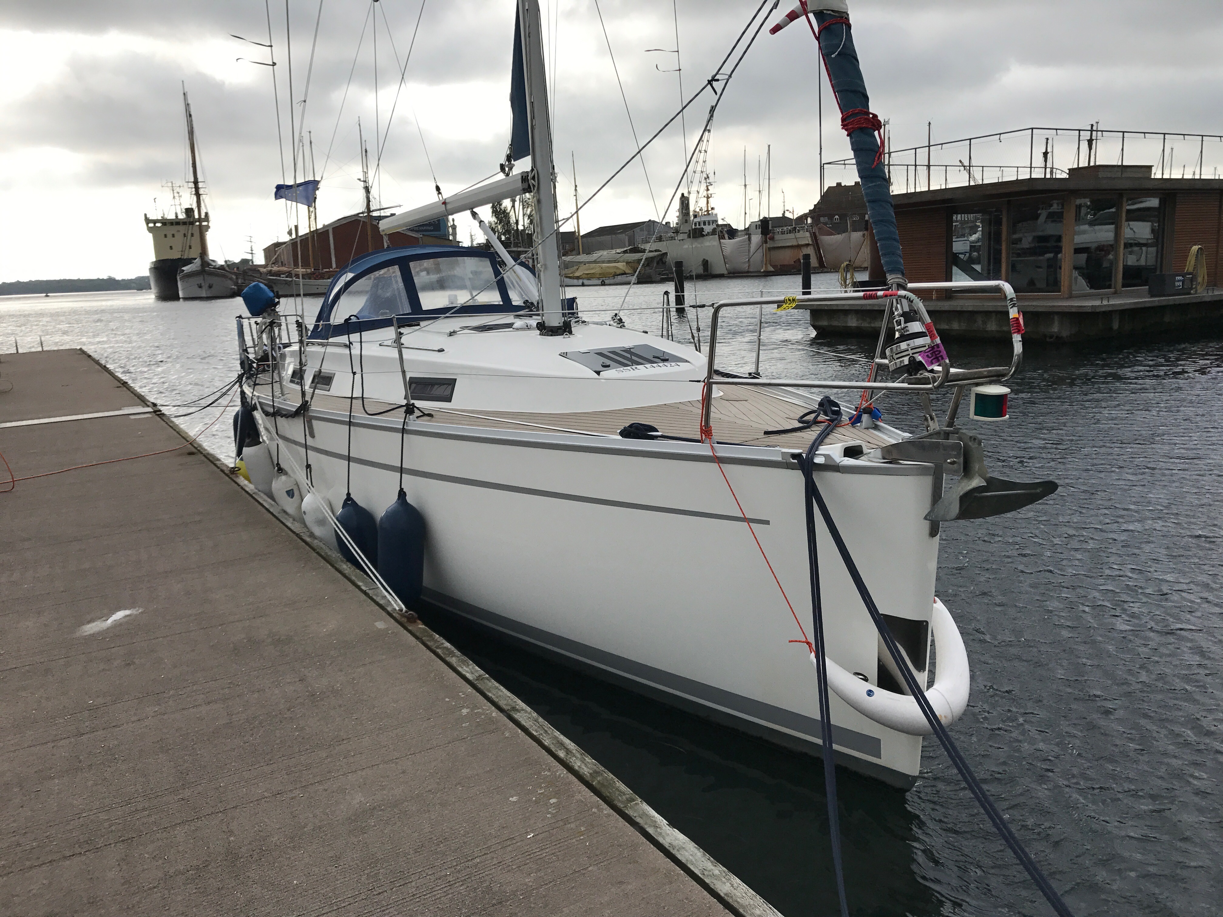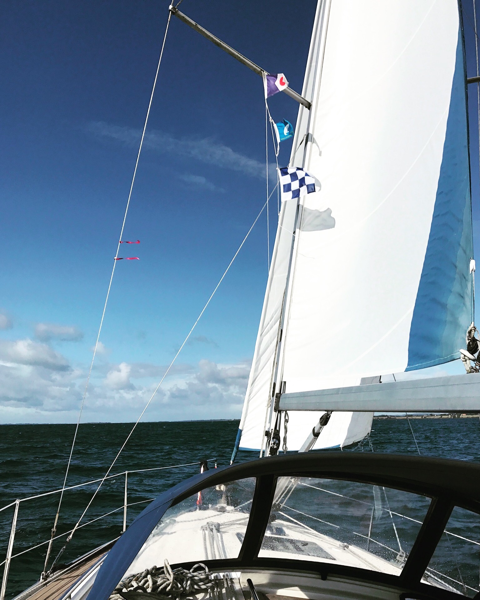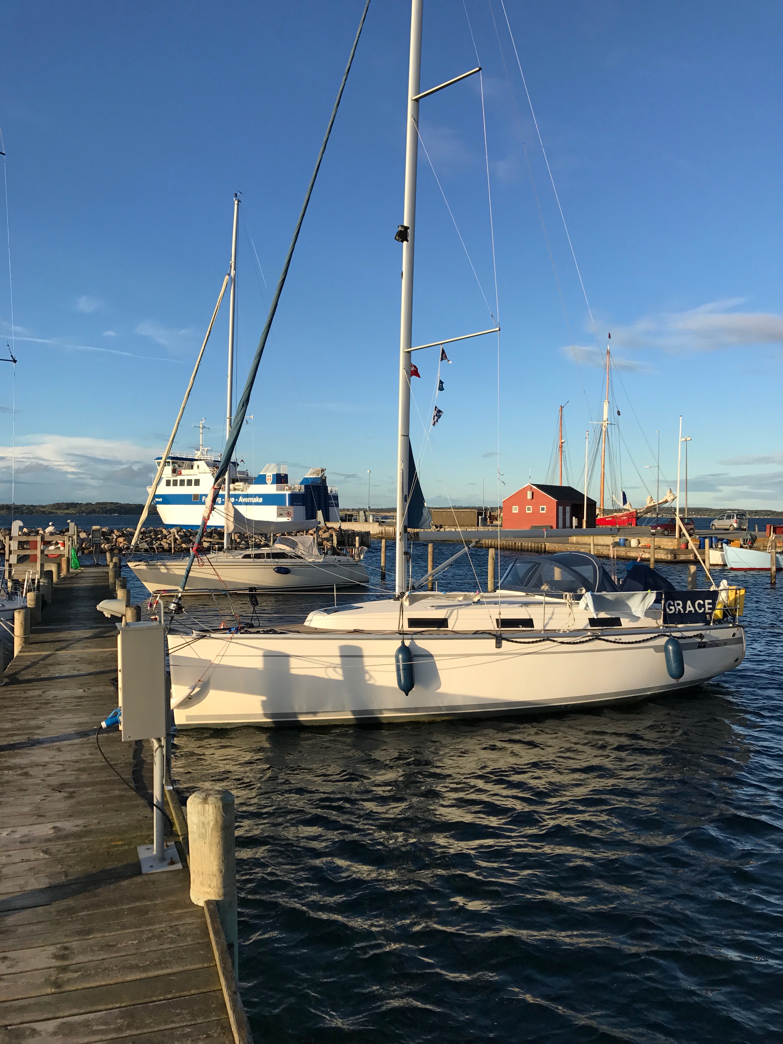 Grace had suffered no ill effects for being abandoned in Svendborg in the gales. All her lines were secure and the fenders had clearly done a good job! The wind had shifted round to the west as we predicted but Grace was still held on to the pontoon by the wind and we were going to have ‘fun’ getting away from the pontoon without drama. We set up a bow spring line to get the stern out and got safely away, going stern first away from the pontoon and out into the fairway. We followed the marked channel under the Svendborg bridge and out towards the island of Skaro to the west cardinal buoy off Vornaes Pynt.