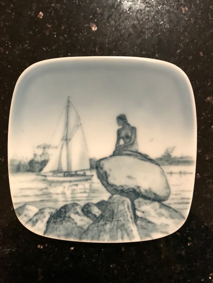 To remind me of Copenhagen and especially of my disappointment in just how small the Little Mermaid really is I’ve a nice Royal Copenhagen pin dish with what could be ‘Grace’ sailing past in the background!