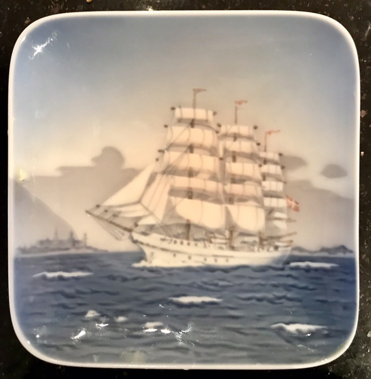 In 1939, at the outbreak of the second world war she was in New York at the World’s Fair to represent her country. She was ordered not to return to Denmark to avoid capture by the Germans and was then offered to the US Coastguard as a training ship and was then based in Connecticut for the duration. By the time she was returned to Denmark in 1946 over 5000 US Coastguard cadets had been trained on her. It was this last fact that convinced me that I would be able to eBay my dish for a small fortune to a nostalgic American with a happy memory of her!