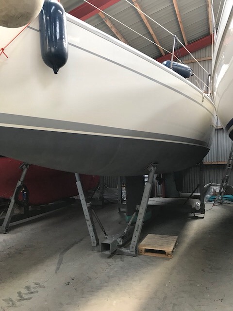 Grace, having spent the winter in a nice warm shed, has had her bottom cleaned and antifouled and just needs a new anode for the saildrive, which I have sourced from the Bruntons, the auto prop manufacturer to be ready to go back in the water when we arrive next week.