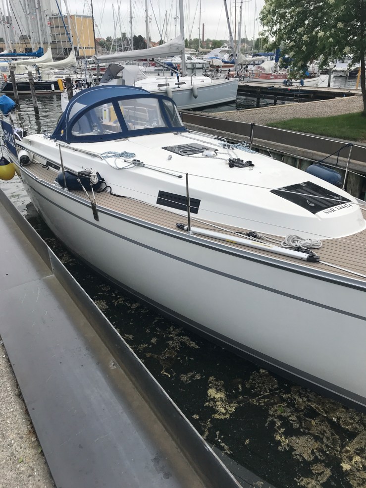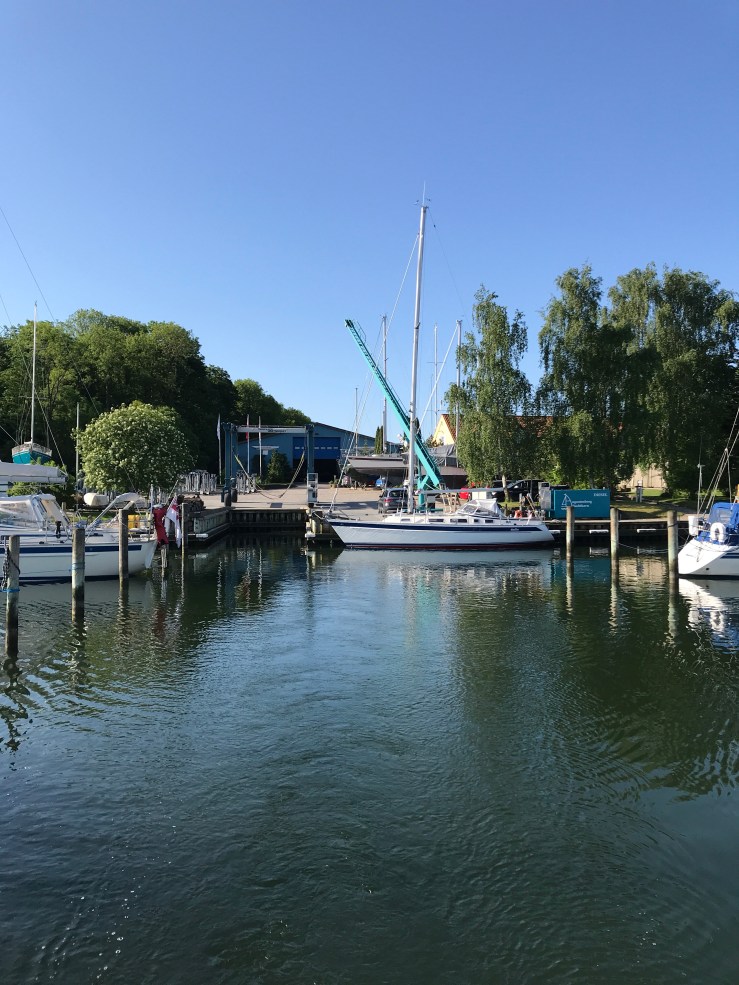 After 7 months out of the water, it is great to see Grace back on the water with her mast up, fuelled, provisioned and ready to go! (…..Well almost! We did need Anders to climb up the mast dangled on a bit of string!). However the unintentional replacement of the topping lift (stops the boom from falling down when the main sail is furled) due to a slight language problem did solve the problem that for the last 18 months I have been hitting my head on the boom every time I step on deck! Simply pulling on the topping lift raises the boom out of my head height…….well worth the investment of 275 Kr!