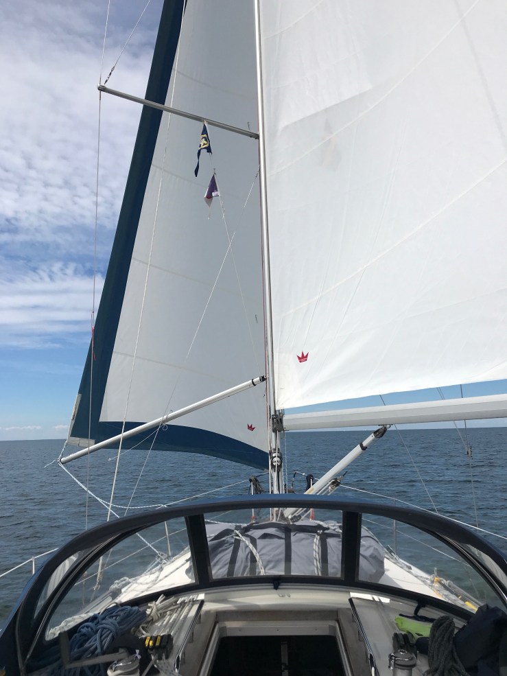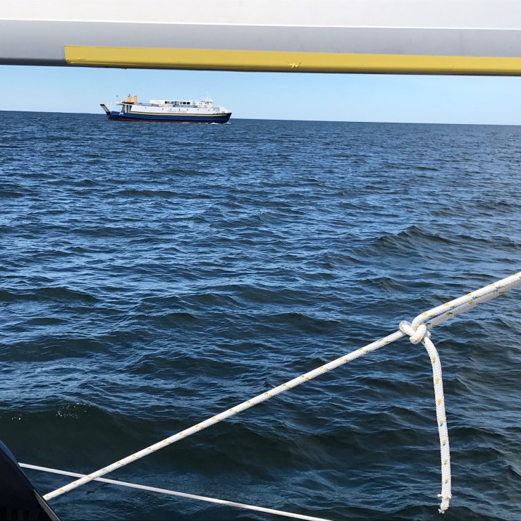 The approach to Figeholm was a gentle introduction to the Skargard!Grace is flying! She is almost at her maximum speed, loping along across the swell (not like a greyhound, she could never be mistaken for one – she’s more like one of those big fat rabbits!) at 5 to 6 knots. We are watching a yacht motoring north in a perfectly straight line converging with us on our starboard side.“Oh it’s okay, they will turn away in a second, you watch”, I say. “He will I think”. Then as there is no sign of action, “Don’t worry I’m sure he has seen us” and then “Oh, I don’t think he will! Quick! Let’s tack!” Just as we start to tack, winch handle on the port winch, “ready about….”. No wait, he is turning away. Leaving it a bit late! There was a flurry in cockpit, a head emerged from the cockpit and I could see the panic when he suddenly saw us. With the German flag flying he swerved away.Continuing on our course for a bit we started to relax until another ‘ghost boat’ came into sight and definitely heading towards us! I checked with the handbearing compass and the angle remained the same – they would hit us. No worries they will turn away, won’t they? We puzzled for a bit – “can you see anyone in the cockpit?” We puzzle for a bit, “Yes, there is someone moving about, they must have seen us! Quick tack!”. It was a towel we had seen moving! I realise that towels are good at reserving beach loungers but are no good at keeping watch on a motoring yacht. We tacked away and back on our course once the danger had passed. The yacht, it’s German flag flying carried on in a dead straight line at 6 knots. Slightly shocked and annoyed we watched as the boat sailed on towards the horizon!I had only just finished exhausting my tirade about beach towels, deckchairs and boats when in the distance coming up steadily behind us was another motoring yacht! This time we were ready for it, the absolutely straightline course is a giveaway for the autopilot. We were not sure why they were motoring, the wind was perfect and we were sailing almost as fast as they were motoring! Here we go again, get ready to dodge. But in good time, he made a clear and positive manoeuvre, just as it should be and we saw the Swedish flag and a but body less hand waved cheerily from the depth of the cockpit as the yacht returned to its original course and was gone.