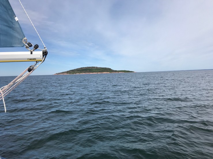 Goose winged and flying across the SundAs we pressed on across the Sund, goose winged we ran past Bla Jungfran, it is basically a pillar of granite that emerges from the seabed, the top of which is only about 500 m in diameter and the water surrounding it is very deep. The pilot book advises to keep away as there is nowhere to moor to it or anchor close by. Personally I’m not sure why you would want to anyway!
