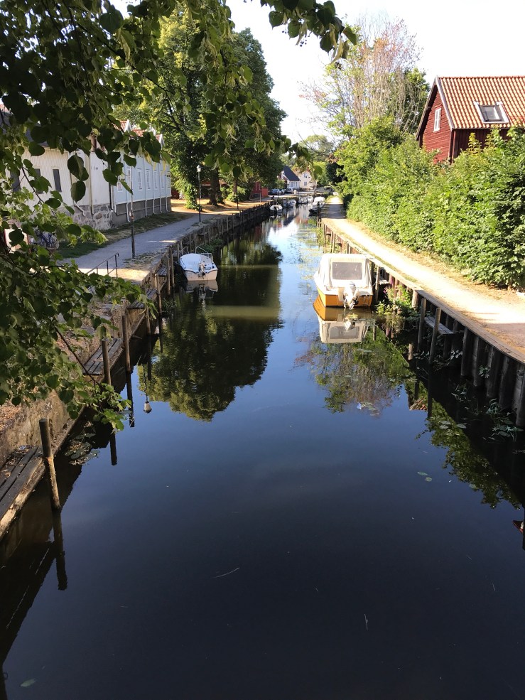 The approach was really pretty, a wide open Fjord with gentle hills sweeping down to the waters edge, very different from the deep gorges around Valdemarsvik or indeed Arkosund. We eyed up several useful places to anchor if we could not get into Trosa itself. As the town and its central canal came into view we spied an unused blue SXK buoy, so headed for it without delay!