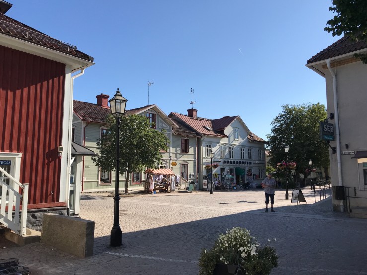 As we made a beeline or it the depth fell, first to 2 m then steadily down to 1.4 m, by which point we should have been firmly aground! However we ploughed on through the mud until reaching the buoy where we stopped with our keel gently held in the silt. It was all very nice and stable and we certainly would not swing about too much! Inflating the dinghy we motored in through the canal and up to an empty bit of harbour wall, clambering up it we tied the dinghy to a very handy lamppost and set off to explore. The town was lovely, brightly painted timbered houses lined the canal, everywhere had scented roses growing round the doors and window boxes full of cheery tumbling geraniums. The town like many others on the archipelago was completely burnt to the ground in the 1730’s by the Russians out of frustration when they failed to capture Stockholm.