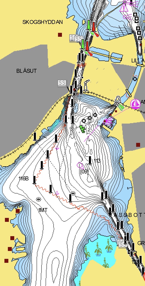 We then took the eastern route across the Navens Grund, a narrow channel through what on the chart seemed a rock strewn wilderness, exiting into the lake at the Navens lighthouse. This route was definitely not for the faint hearted, a channel barely wider than Grace’s 3.4 m girth twisting its way through vicious looking inky black rocks that broke the surface in clouds of white spray. For several hours we sweated our way along the channel until we could see our goal, the lighthouse and the open water. This just filled us full of dread. Huge waves pound the surrounding rocks, until then we had been relatively sheltered but now we got the full force of the wind and Grace became quite tricky to steer and the narrow confines of channel. Oh well, we could not turn back, there just was not room to turn and in the swell we would never find the start of the channel again, we would just have to go on. I am so glad we did this at the end of the trip and not at the start – I’d have wrecked the boat, I just knew that Grace would keep us safe.